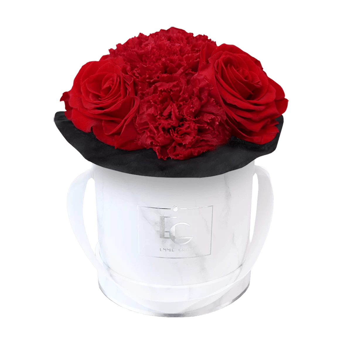 Wenn Sie auf der Suche nach einer frischen und romantischen Kreation sind, ist das CHARMING SET die perfekte Kombination. Die Rosebox in dem außergewöhnlichen Splendid Carnantion Design überzeugt mit ihrem glamourösen Auftritt. Die Scented Candle Pure Peony & Jasmine ergänzt das Arrangement mit den Komponenten Pfingstrose, Jasmin und roter Apfel und verleiht jedem Zuhause eine ganz besondere Wärme. Zusätzlich ist in dem Set der hochwertige Classic Brush enthalten, der das Bouquet jahrelang wie am ersten Tag strahlen lässt.