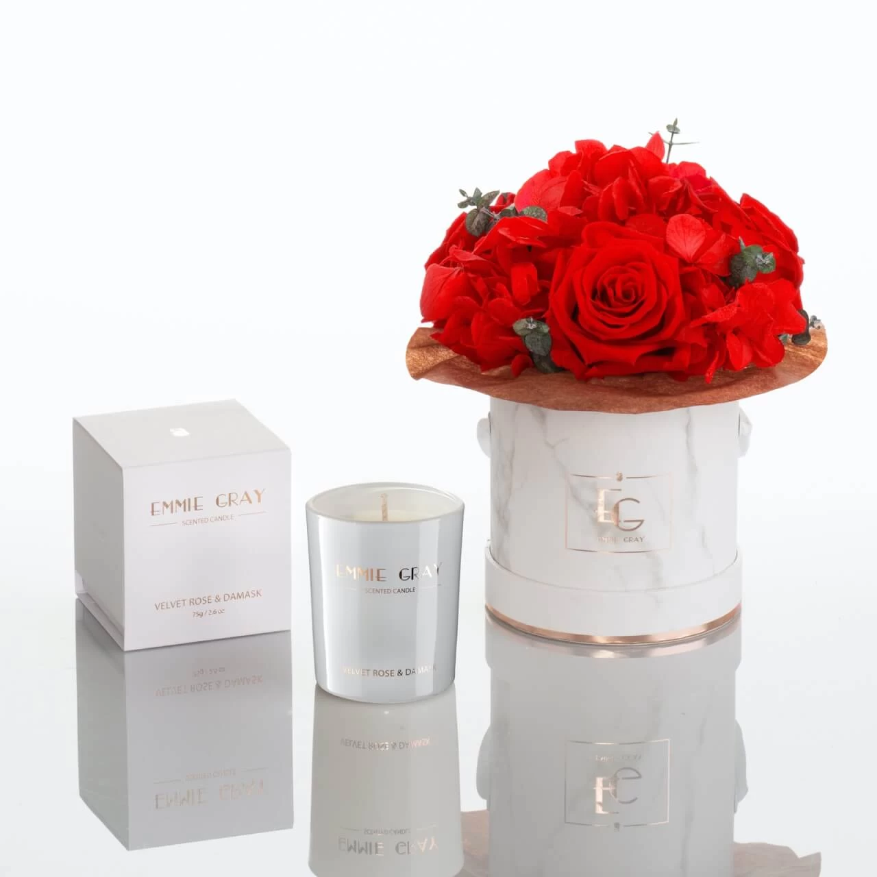 Die neuen Infinity Hortensien überzeugen in diesem Set in straußförmiger Kombination mit Rosen in der edlen Marmor-Rosebox. Abgerundet wird das Set mit dem intensiven Duft von Damaszener-Rose, Gewürznelke und Oud-Holz der Velvet Rose & Damask Scented Candle. Roségoldene Details verleihen diesem Duett einen Hauch Luxus und machen es zum perfekten Interior Highlight!