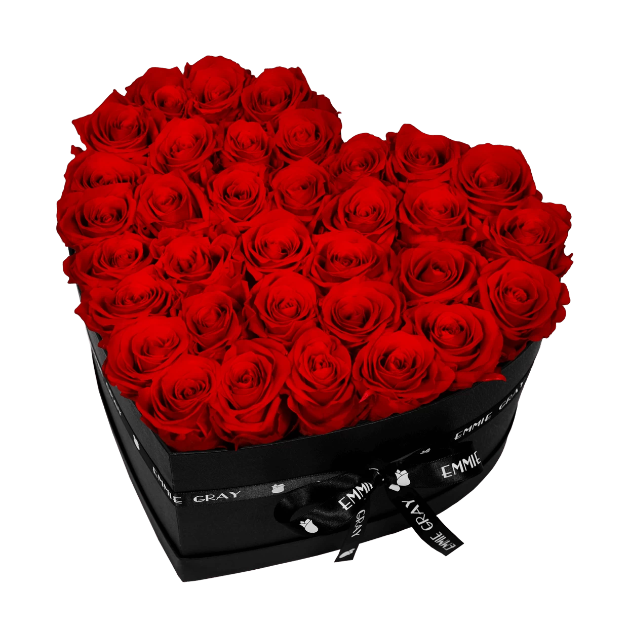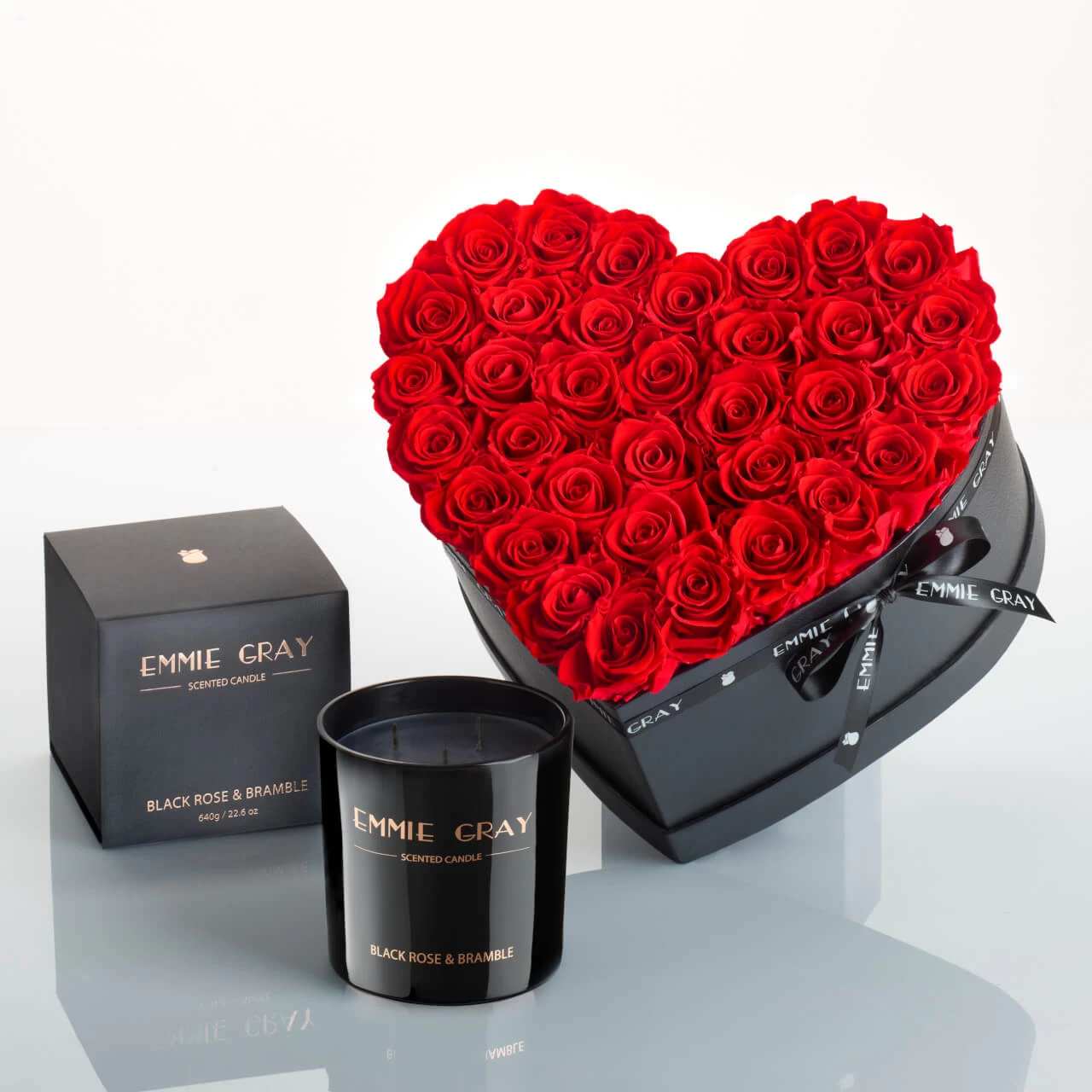 Verführerisches Vibrant Red arrangiert in der herzförmigen Rosebox kombiniert mit dem unwiderstehlichen Duft von Brombeere, Zedernholz und Lorbeerblättern der Black Rose & Bramble Scented Candle. Die edlen roten Rosen und der holzig-süße, vitalisierende Duft lassen Herzen garantiert höher schlagen!