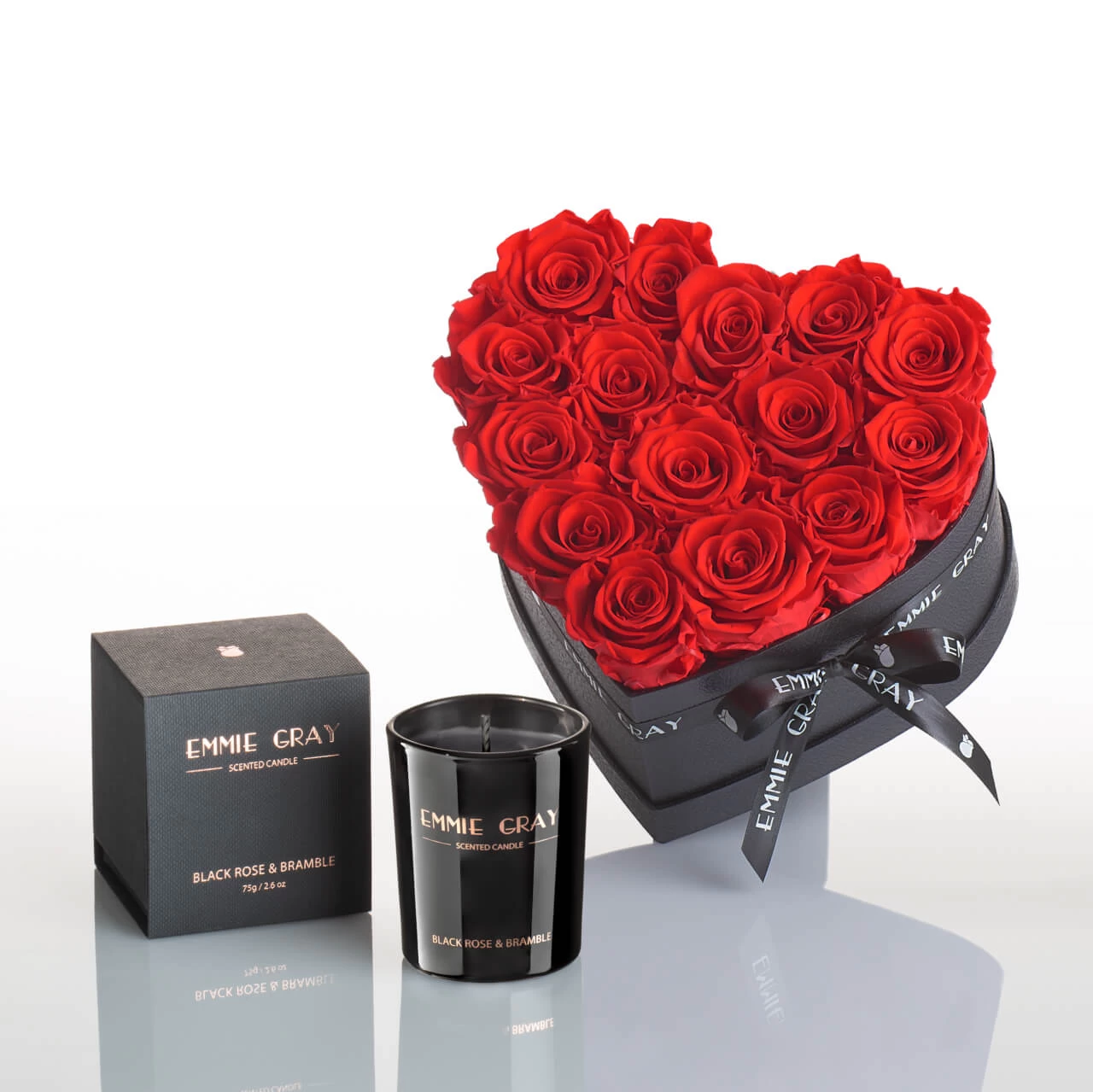 Verführerisches Vibrant Red arrangiert in der herzförmigen Rosebox kombiniert mit dem unwiderstehlichen Duft von Brombeere, Zedernholz und Lorbeerblättern der Black Rose & Bramble Scented Candle. Die edlen roten Rosen und der holzig-süße, vitalisierende Duft lassen Herzen garantiert höher schlagen!