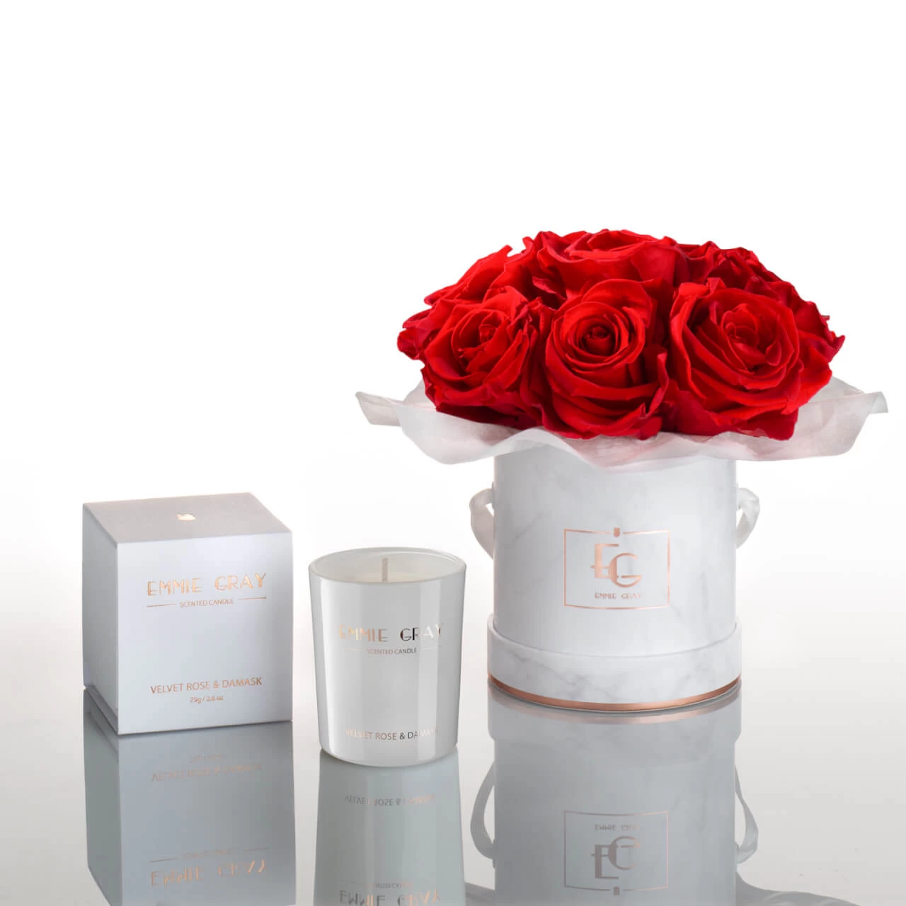 Infinity Rosen in straußförmiger Rundung arrangiert in der neuen Marble Rosebox im Duett mit dem intensiven Duft von Damaszener-Rose, Gewürznelke und Oud-Holz der Velvet Rose & Damask Scented Candle. Roségoldene Details verleihen dieser Kombination einen Hauch Luxus und machen sie zum perfekten Geschenk!