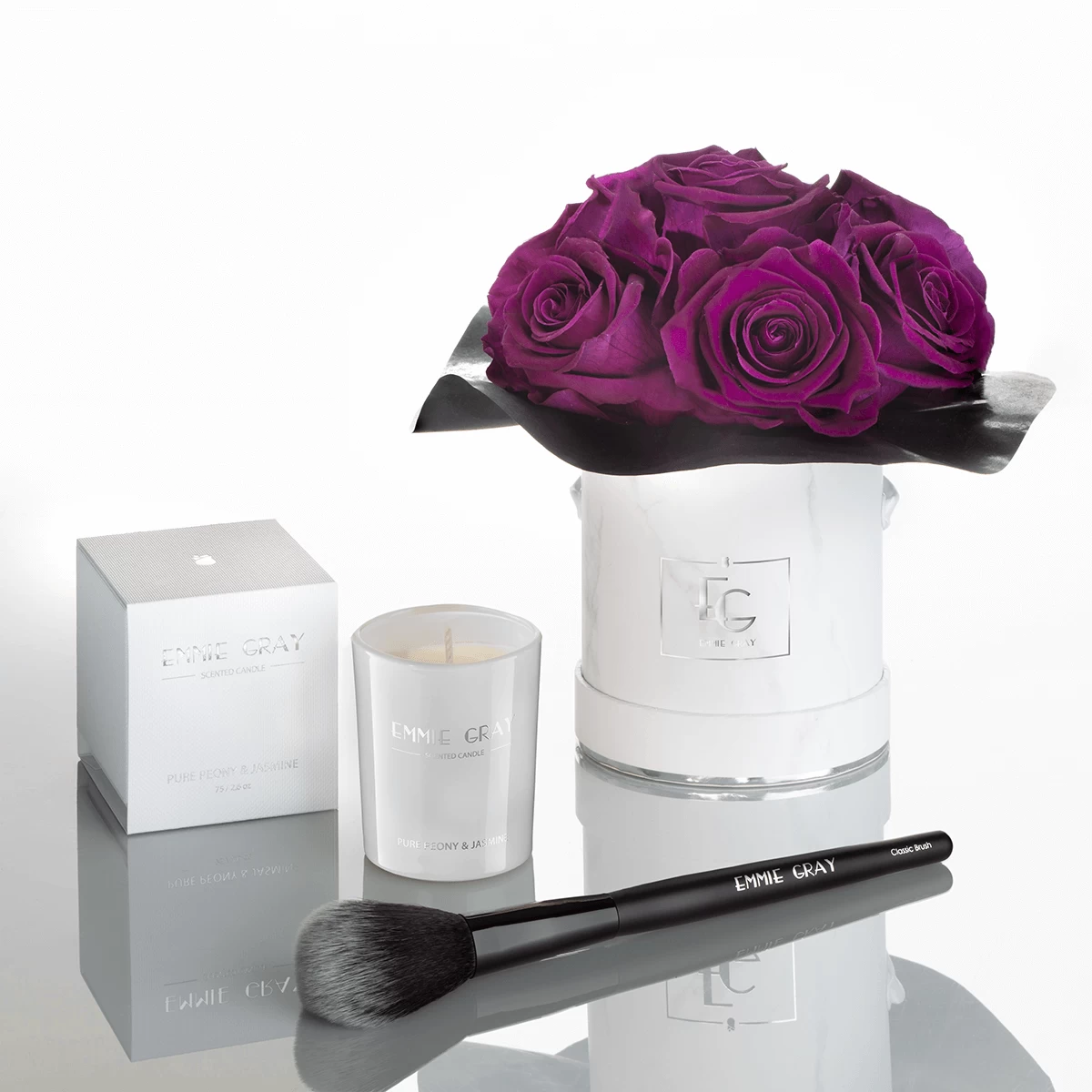 Das stilvolle Marble-Design trifft auf elegantes Velvet Plum – das arrangierte Bouquet lässt die Herzen aller Design-Liebhaber höher schlagen! In Kombination mit dem Bestseller Pure Peony & Jasmine aus der Scented Candle Collection überzeugt das Set in seiner Gesamtheit. Der zarte einnehmende Duft von Jasmin, Pfingstrose und rotem Apfel verwöhnt die Sinne auf einer ganz besonderen Ebene. Zusätzliches Highlight ist der CLASSIC BRUSH der für jahrelange frische Ihres Bouquets sorgt.