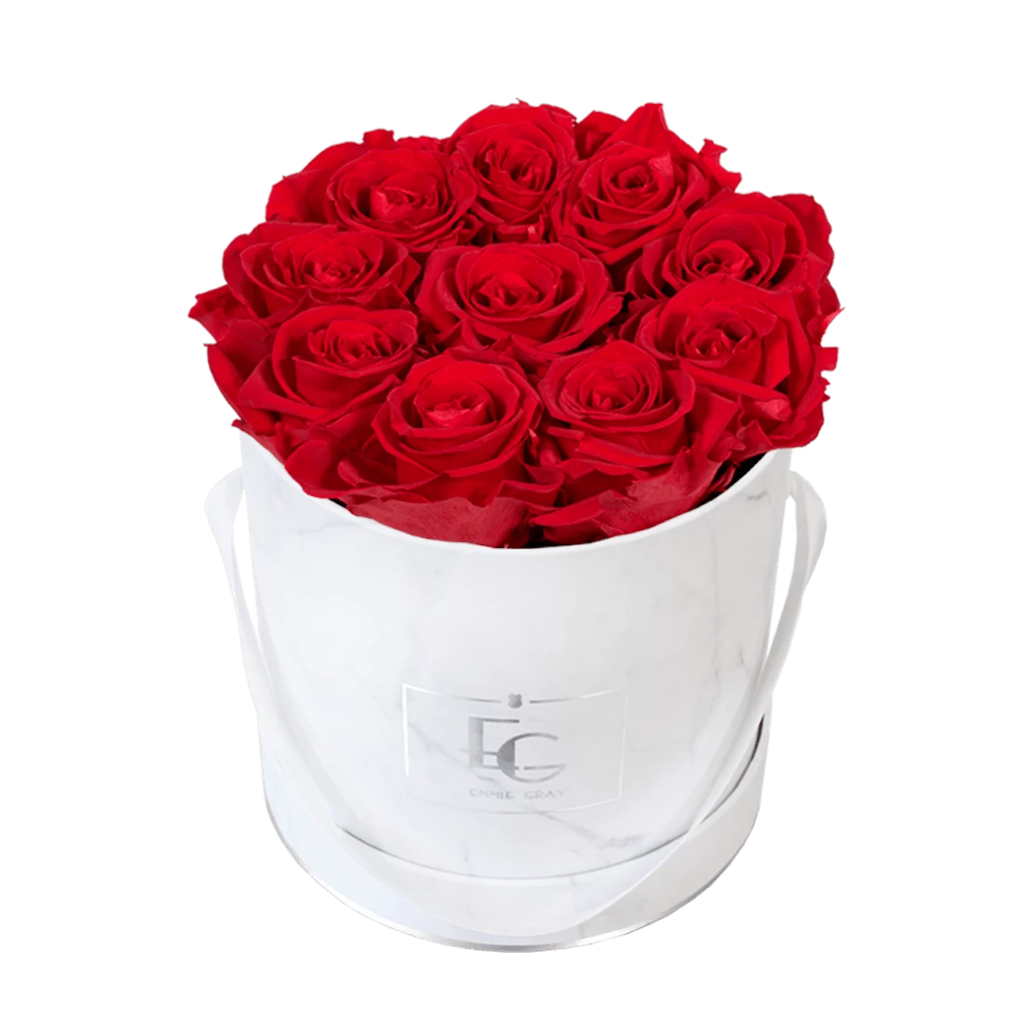 Leuchtend rote Infinity Rosen in der edlen Marble Silver Rosebox kombiniert mit dem sinnlich, floralen Duft von Pfingstrose, Rotem Apfel und Jasmin der Pure Peony & Jasmine Scented Candle. Mit dem Classic Brush als pflegendes Accessoire ist dies die perfekte Kombination für Marmor-Liebhaber und alle, die edles und luxuriöses Design lieben.