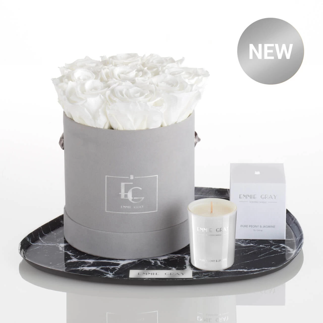 Dezentes Pure White in der grauen Velvet Rosebox kombiniert mit dem floralen Duft von Pfingstrose, Rotem Apfel und Jasmin. Verzaubern Sie Ihre Liebsten mit harmonischen Farbtönen und der einzigartigen Scented Candle Pure Peony & Jasmine. Ideal abgerundet wird diese Komposition mit dem exklusiven (Premium) Marble Metallic Tablett aus glänzendem Edelstahl. Das Tablett im stilvollen Marmorlook besticht mit silberfarbener Veredelung und wird zum extravaganten Blickfang in jedem Wohnraum.