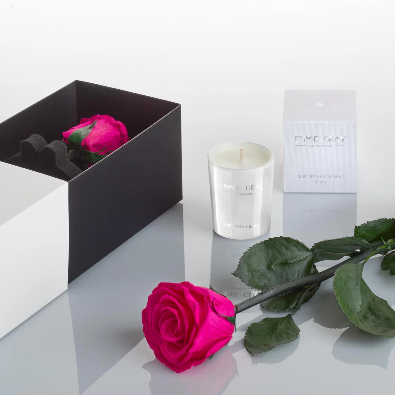 Mit einer Stiellänge von 50 cm verzaubern die Long Stem Infinity Roses in ihrer vollen Schönheit und eignen sich perfekt für jeden Anlass. Perfekt abgerundet wird dieses Set mit dem sinnlich, floralen Duft von Pfingstrose, Rotem Apfel und Jasmin der Pure Peony & Jasmine Scented Candle.