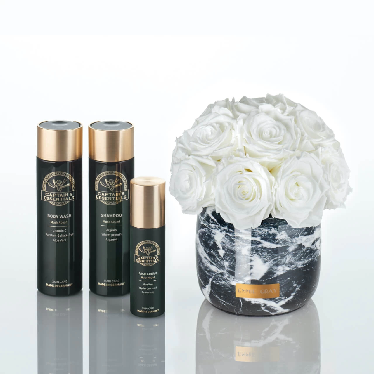 Dieses exklusive Set zu besonderen Konditionen beinhaltet: PREMIUM MARBLE METALLIC INFINITY PURE WHITE (S) | CAPTAIN`S ESSENTIALS FACE CREAM (ONE SIZE) | CAPTAIN`S ESSENTIALS SHAMPOO (ONE SIZE) | CAPTAINS ESSENTIALS BODY WASH (ONE SIZE)