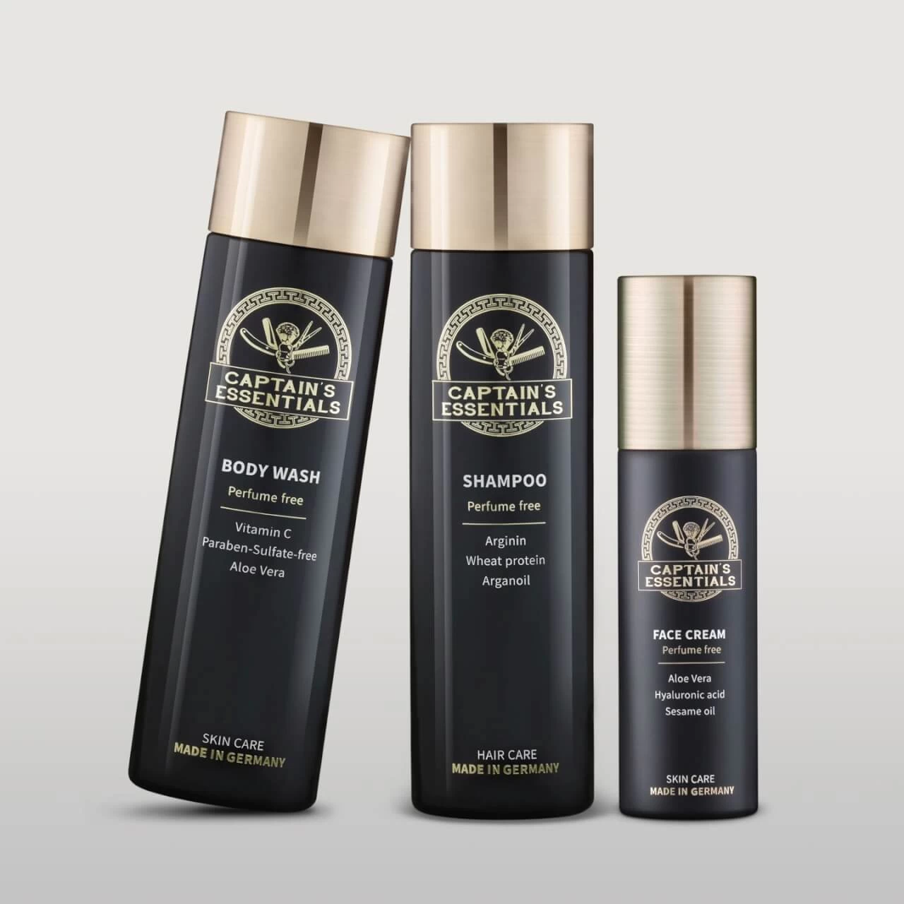 Das Trio aus dem Captain’s Essentials Shampoo, Body Wash sowie der Face Cream ist der ideale Alltagsbegleiter für alle Männer, die Wert auf eine hochwertige Pflege legen. Das auf Arginin, Weizenprotein und Arganöl basierende Shampoo und die Waschlotion mit Aloe Vera, Arginin und stabilisiertem Vitamin C überzeugen mit ihren ausgesuchten, natürlichen Inhaltsstoffen und wirken sich stimulierend sowie regenerierend auf Haut und Haar aus. Die Captain’s Essentials Gesichtscreme spendet mit ihren Hauptinhaltsstoffen Aloe Vera, Hyaluronsäure und Sesamöl tiefenwirkend Feuchtigkeit und lässt jede Männerhaut strahlen.