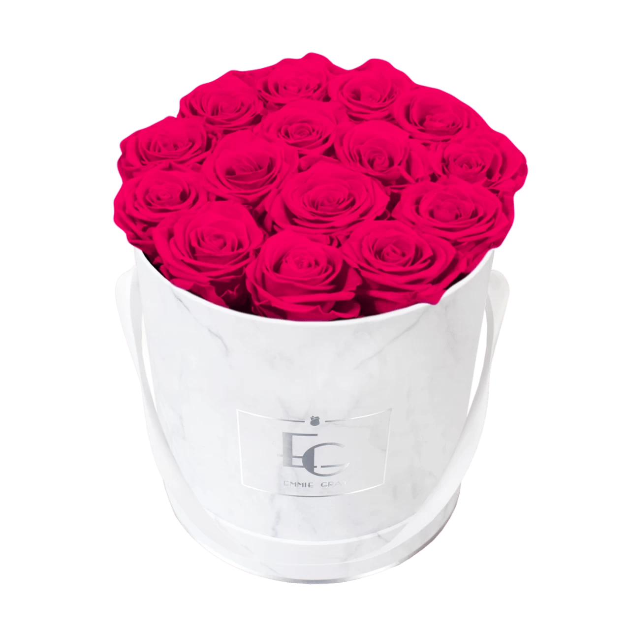 Unnachahmliche Eleganz in einem Set kombiniert – die Rosebox in dem hochwertigen Marble-Design arrangiert in einem luxuriösen Hot Pink. Die silbernen Details verleihen diesem Set ein edles Finish. Dazu abgestimmt gehört zu diesem Set die Pure Peony & Jasmine Duftkerze, die mit einem elegant aufregenden Duft aus Jasmin, Pfingstrose und rotem Apfel die Sinne verzaubert. Exklusiv in diesem Set ist der CLASSIC BRUSH enthalten, dieser lässt jedes Bouquet jahrelang erstrahlen.
