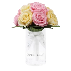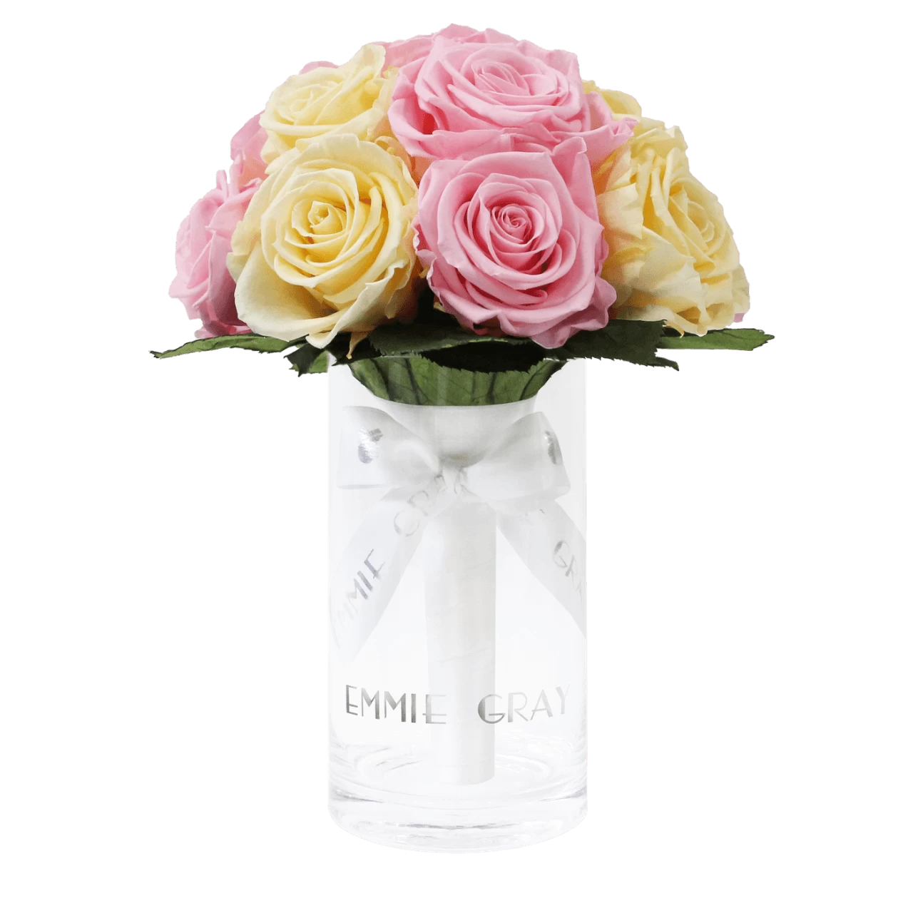Die Bouquets unserer Romantic Collection werden als klassischer Strauß gebunden und verzaubern in einer edlen Komposition aus zarten Farben, ausgewählten Infinity Rosen und Nelken sowie farblich abgestimmtem Satinband. Das Arrangement kann in der mitgelieferten exklusiven EMMIE GRAY Glasvase oder einem beliebigen anderen Gefäß platziert werden und verschönert jahrelang Ihr Interieur. Ganz gleich ob als Hochzeitsaccessoire oder neues It-Piece für Ihr Zuhause – unsere Romantic Bouquets garantieren ewige Freude wie am ersten Tag.