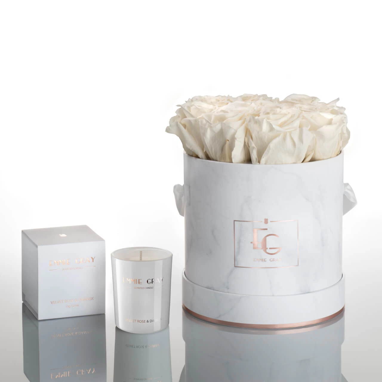 Erleben Sie ein einzigartiges Dufterlebnis mit dem Aroma der Velvet Rose & Damask Scented Candle, die geschmeidige Damaszener Rose mit intensiver Gewürznelke und Oud-Holz kombiniert. Veredelt in Roségold bildet das Highlight dieses Sets die neue Marble Rosebox mit Rosen in Pure White. Perfekt als Geschenk oder um sich selbst mit etwas Besonderem zu verwöhnen!