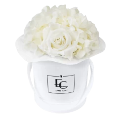 Die natürlichen Rosen und Hortensien unserer Splendid Hydrangea Infinity Collection werden mithilfe eines besonderen Verfahrens konserviert und bleiben ein bis drei Jahre haltbar. Die prachtvollen Arrangements verzaubern durch ihr farbenfrohes Blühen in klassischer Rundung.
